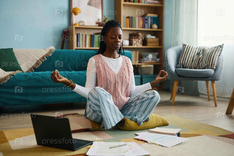 Медитирующая афроамериканская женщина в уютной гостиной