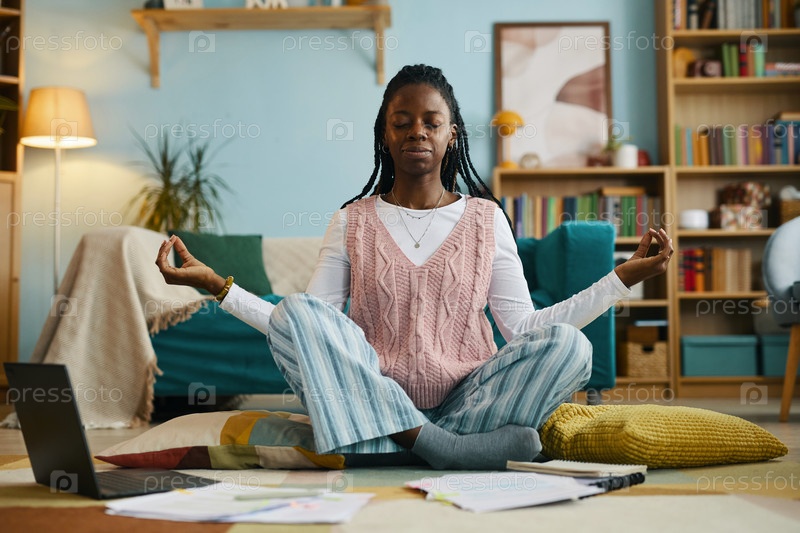 Медитация молодой афроамериканской женщины в уютной гостиной