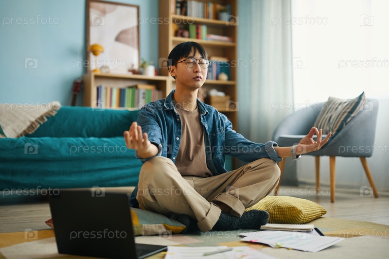 Портрет молодого человека, медитирующего в гостиной