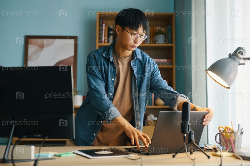 Работа на ноутбуке в современной домашней офисной обстановке