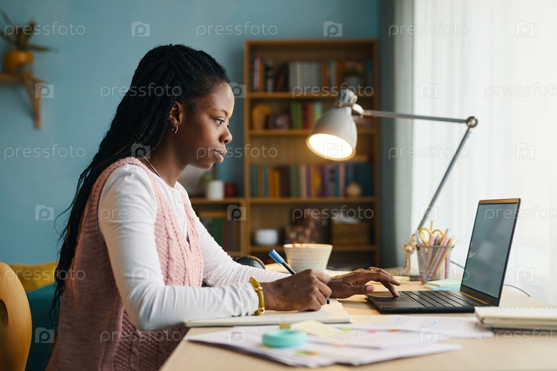Сосредоточенная афроамериканская женщина, работающая на ноутбуке