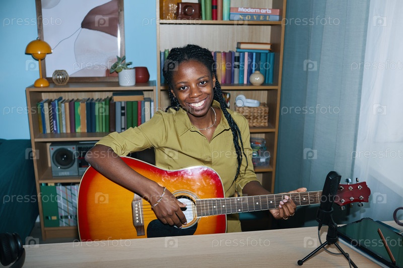 Улыбающаяся женщина играет на гитаре в уютном домашнем учебнике