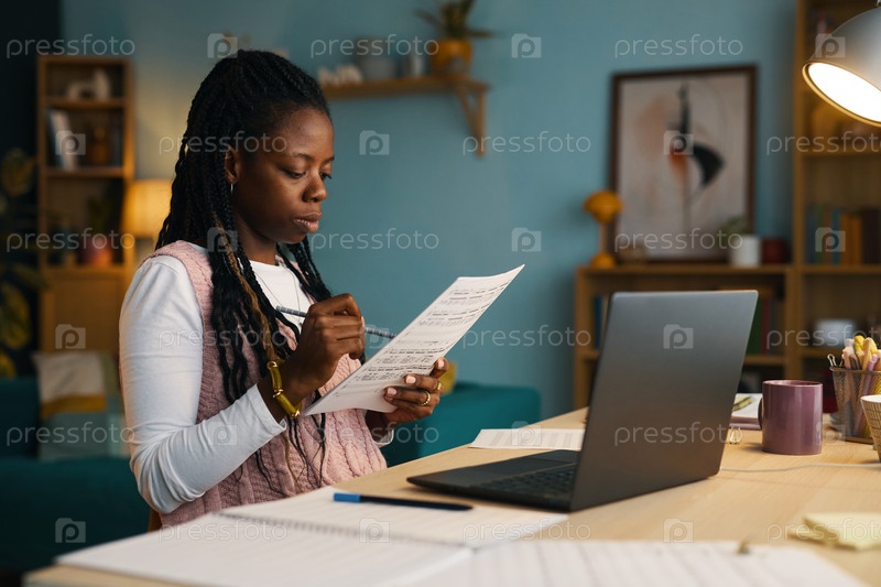 Фокусированная афроамериканская женщина анализирует документ в офисе