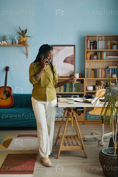 Разговор по телефону в современном домашнем офисном пространстве