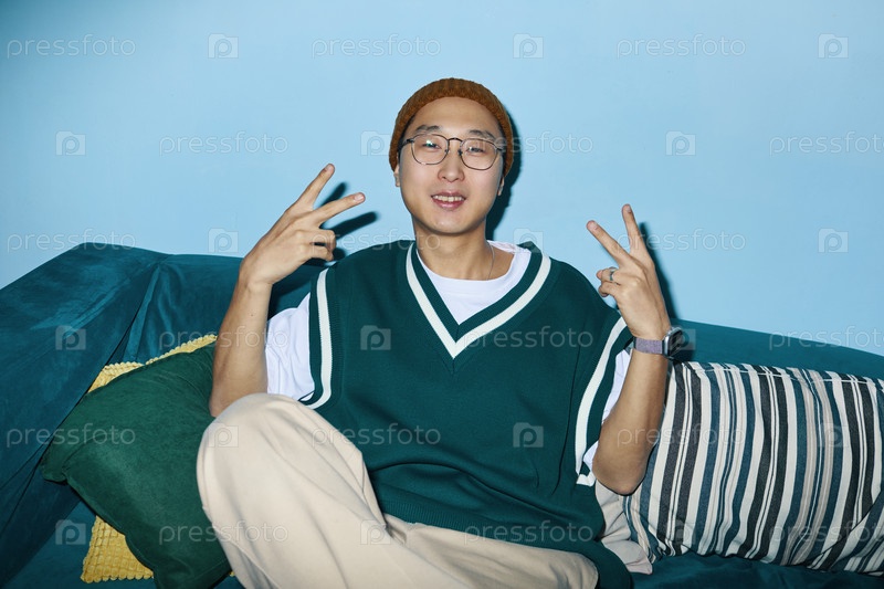 Портрет азиатского мужчины, делающего мирные знаки во время отдыха