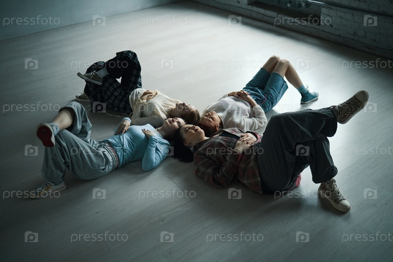 Люди, лежащие на полу и отдыхающие в современном пространстве