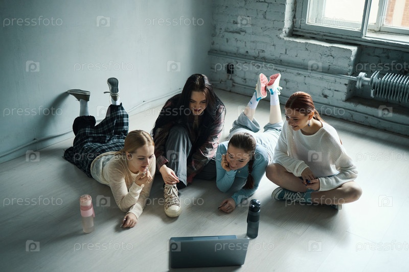 Группа молодых женщин, смотрящих на ноутбук в случайной обстановке