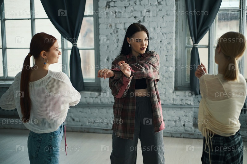 Практика танцевальных движений внутри просторного студийного зала