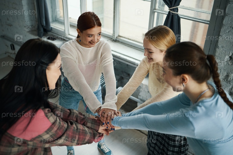 Команда разнообразных молодых женщин, сотрудничающих и улыбающихся вместе