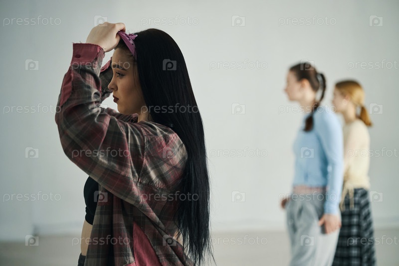 Молодая женщина корректирует прическу в танцевальной студии
