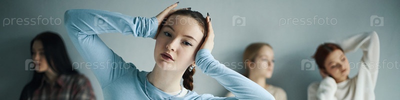 Портрет молодой женщины, держащей голову с другими на заднем плане