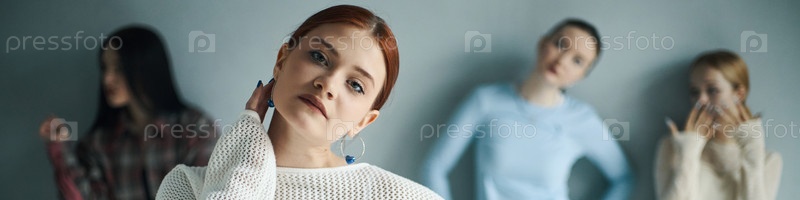 Портрет молодой женщины, глядящей в камеру с друзьями на заднем плане