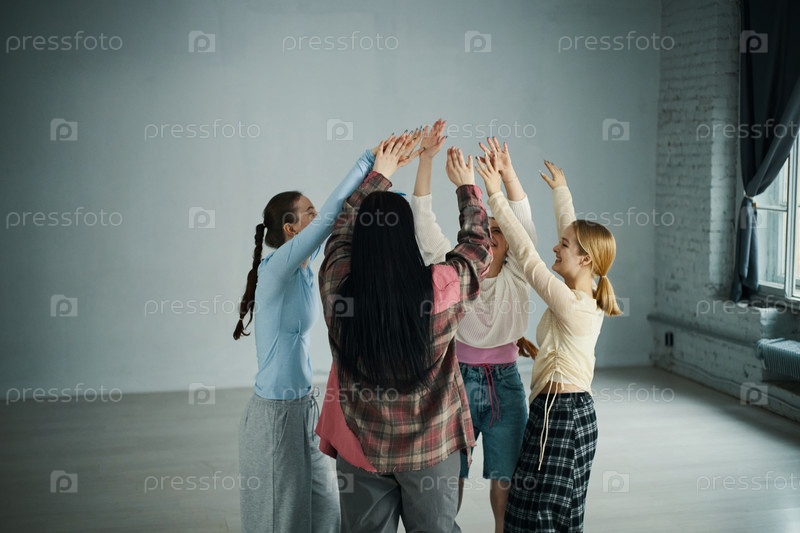 Группа молодежи, которая празднует и возвышается в яркой комнате