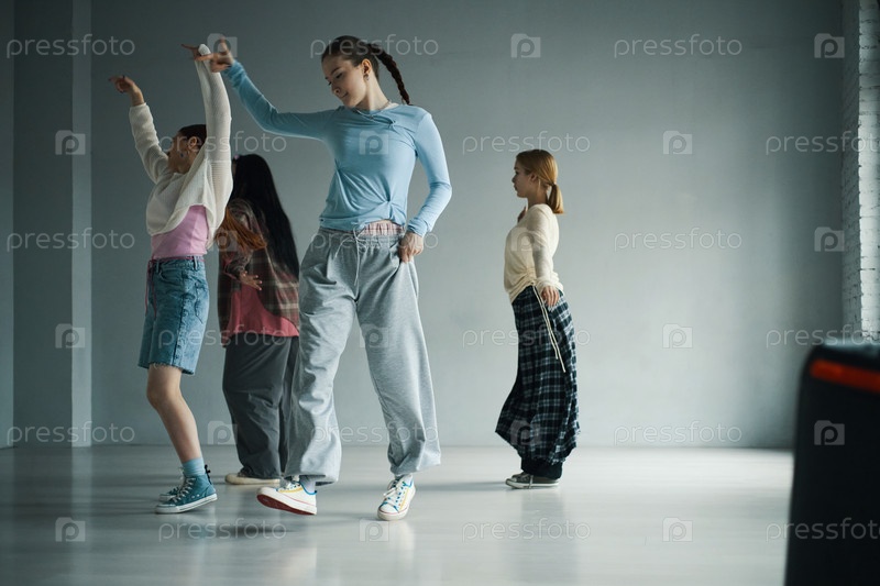 Группа разнообразных подростков, практикующих танцевальную рутину в помещении