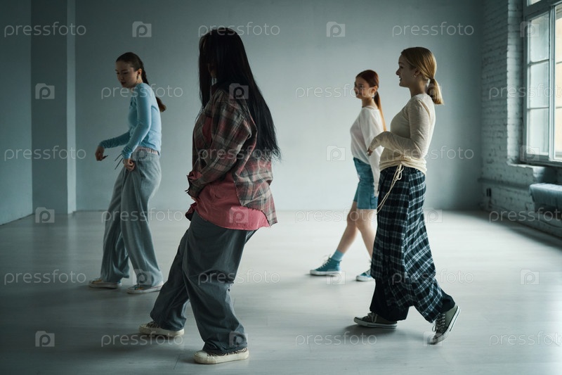 Четыре молодых женщины, танцующие в современной моде