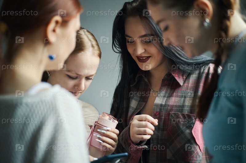 Улыбающиеся молодые женщины делятся вместе мобильным телефоном