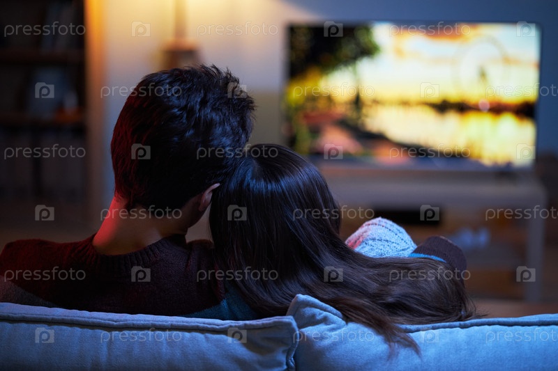 Молодая пара смотрит фильм дома