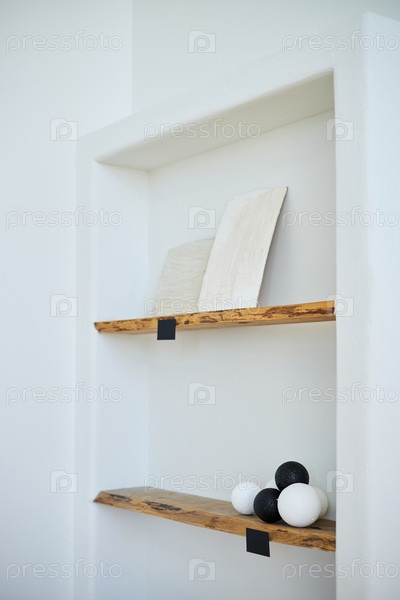 Деревянные полки с минималистическими декоративными предметами