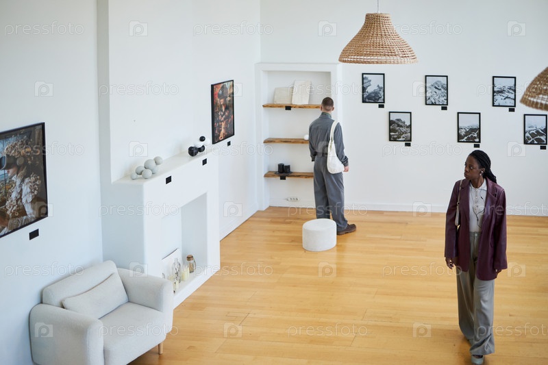 Просмотр искусства в современном пространстве галереи с белыми стенами