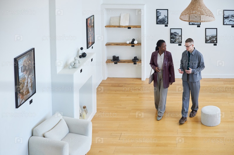 Два человека обсуждают дизайн интерьера в современном пространстве галереи