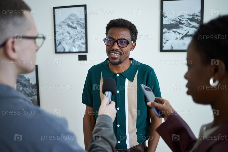 Интервью с мужчиной в зеленой рубашке во время художественной выставки