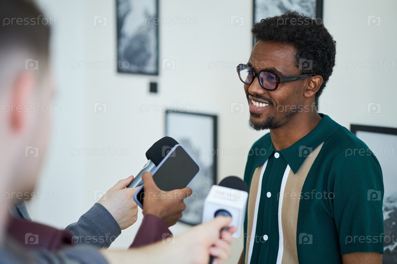 Улыбающийся мужчина получает интервью от репортеров в офисной обстановке