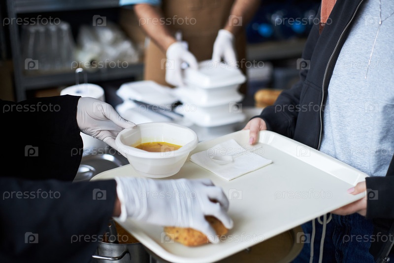 Сервирование супа и хлеба людям на общественной кухне