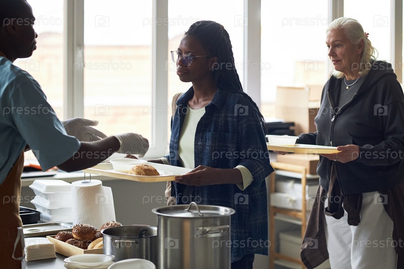 Волонтеры, подающие еду на суп-кухне в течение дня
