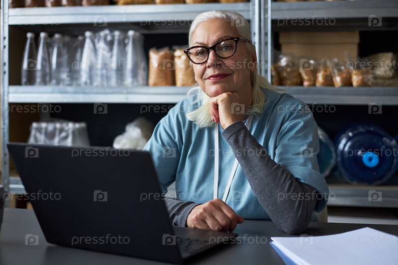 Портрет пожилой женщины, работающей на ноутбуке в складе