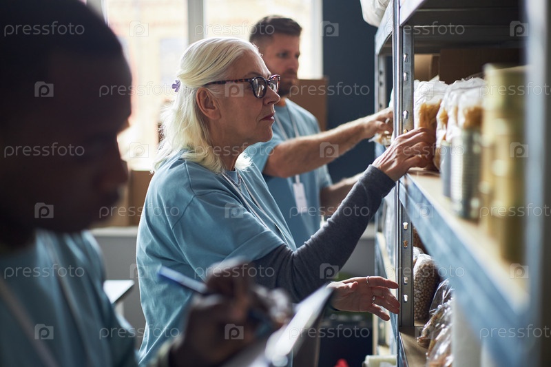 Группа сотрудников, организующих предметы на полках