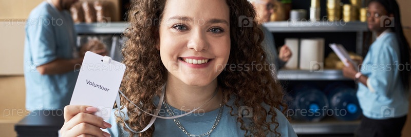 Портрет женщины, держащей значок волонтера и улыбающейся на камеру