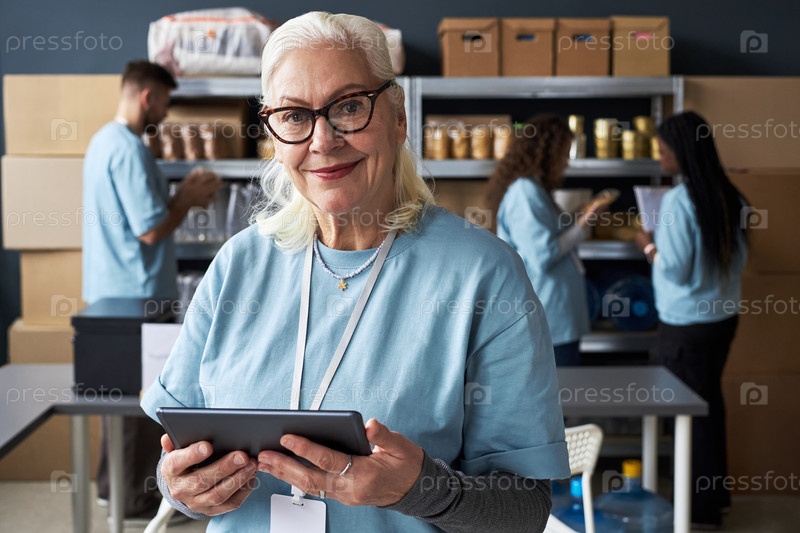 Портрет пожилой женщины, держащей планшет в волонтерском центре