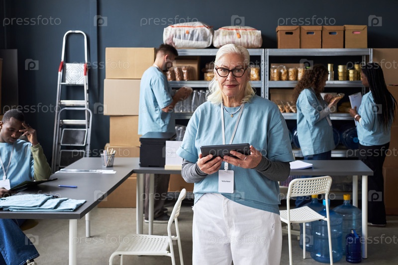 Портрет старшей женщины, держащей планшет в современной офисной обстановке