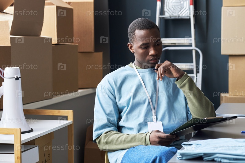 Молодой складский работник проверяет инвентарь с помощью клипборда