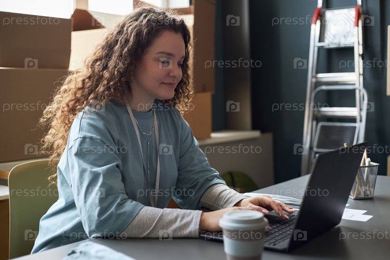 Молодая женщина работает за рабочим столом с ноутбуком в офисной обстановке