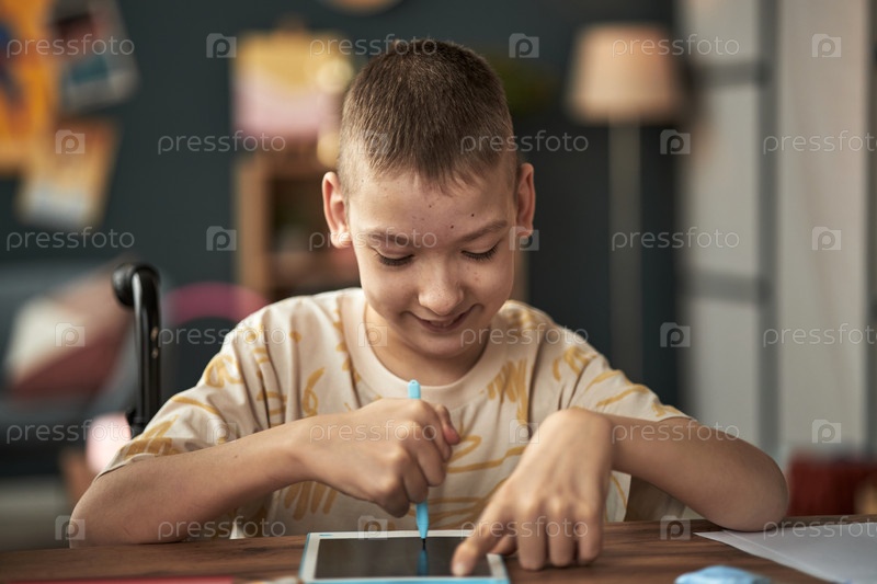 Улыбающийся мальчик с инвалидностью рисует на планшете в уютной обстановке гостиной
