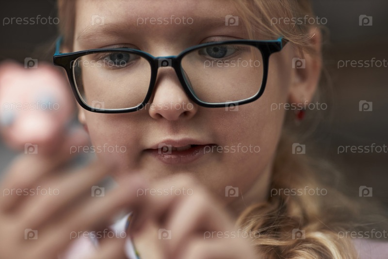 Носящие очки Девочка, внимательно изучающая небольшие предметы