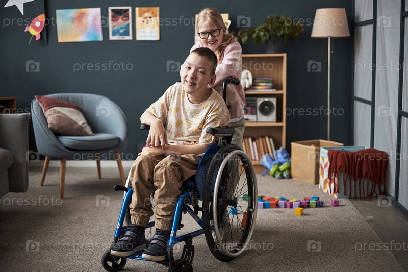 Улыбающийся мальчик на инвалидном кресле с улыбающейся девочкой в игровой комнате