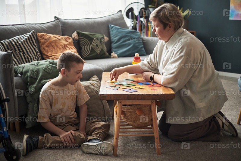 Репетитор играет в образовательную игру с мальчиком-инвалидом