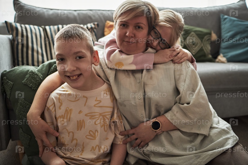 Портрет заботливой матери, обнимающей двух детей дома