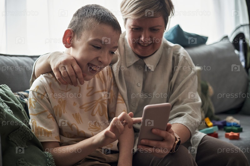 Портрет счастливого мальчика с инвалидностью и взрослого, использующего смартфон вместе