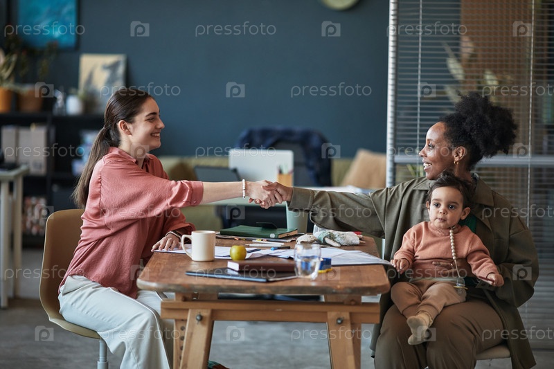 Деловая консультация между двумя женщинами с присутствием ребенка