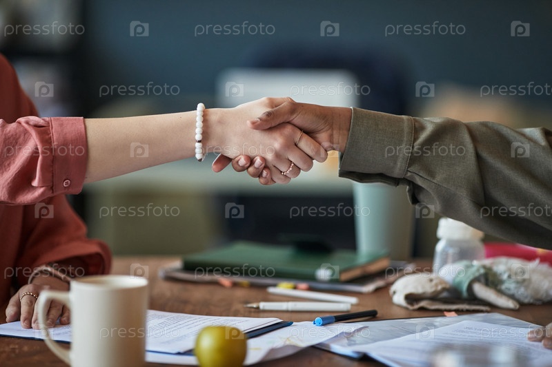Бизнесмены пожимают друг другу руки из-за контракта за столом заседаний