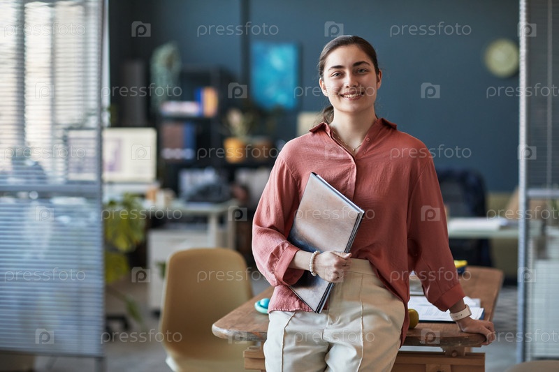 Портрет улыбающейся деловой женщины, держащей в руках клипборд в офисе