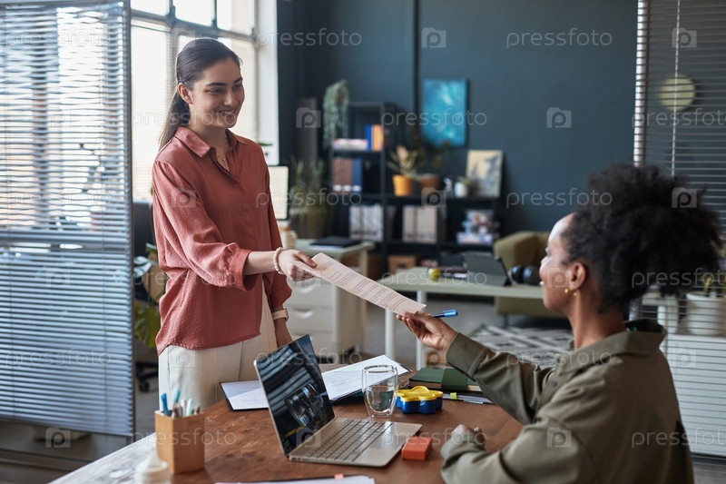 Передача документа в офисной обстановке с двумя разными женщинами