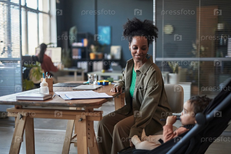 Афроамериканская женщина, работающая в современном офисном помещении