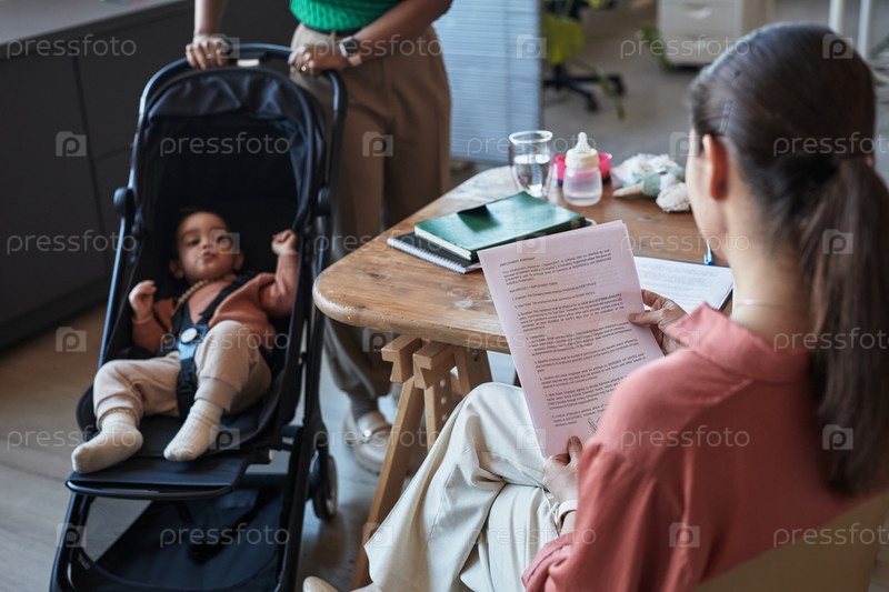 Деловая женщина читает документы, пока ребенок в коляске