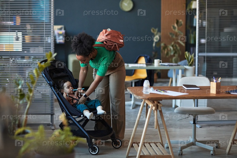 Мать помогает ребенку в коляске в современном кафе