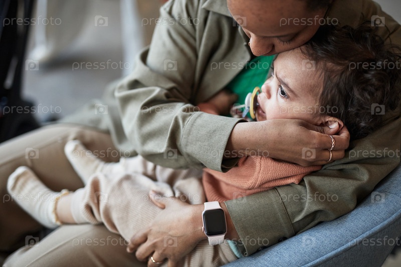 Утешительный плачущий малыш сидит на груди взрослого, носящего часы