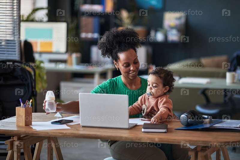 Рабочая мать заботится о младенце в домашней офисной обстановке